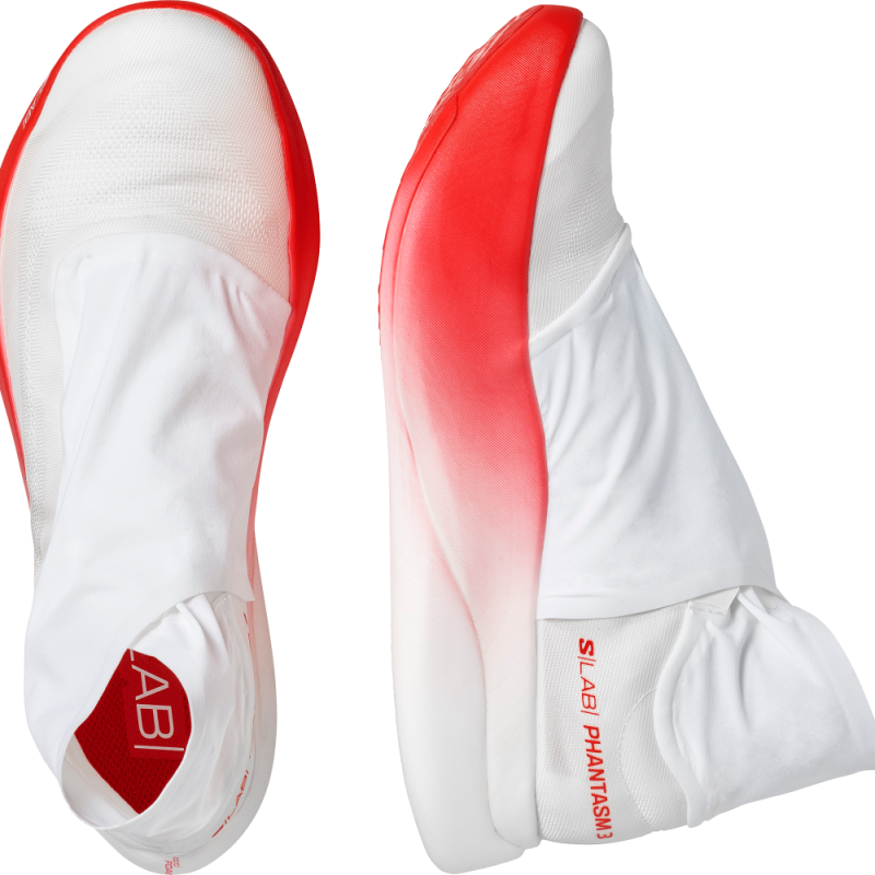 Der S/LAB Phantasm 3 verfügt über eine brandneue „Cache-Coeur“-Oberkonstruktion mit einer Gamasche, die die Schnürsenkel bis zum Knöchel bedeckt. Dadurch wird eine glatte Oberfläche über den gesamten Fuß geschaffen. Die Zwischensohle wurde mit einer einzigartigen Konstruktion entwickelt, um alle Übergänge abzurunden und scharfe Kanten zu vermeiden. Dadurch wird die Aerodynamik verbessert. Sie verfügt über mehr optiFOAM+ in der Zwischensohle aus PEBA-Schaumstoff. Dieser ist weicher und widerstandsfähiger und bietet so die nötige Elastizität, um bei hohen Geschwindigkeiten weiter voranzukommen. Die löffelförmige Energyblade-Carbonplatte wird mit einer überarbeiteten Rocker-Konstruktion kombiniert. Der Drop wurde von 37 mm/28 mm auf 39 mm/33 mm reduziert, was der Stack-Grenze von 40 mm der Weltleichtathletikorganisation entspricht. Die aggressivere Geometrie verbessert den Vortrieb.